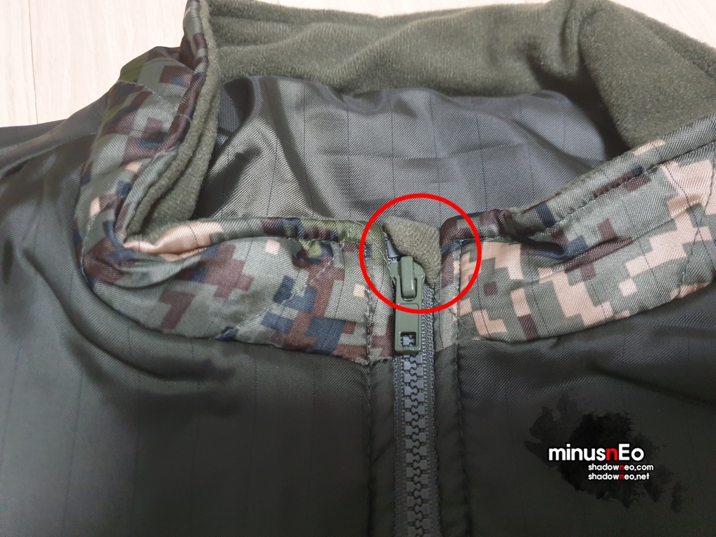 지퍼 최상위부분도 기모(napping)처리를 했다.