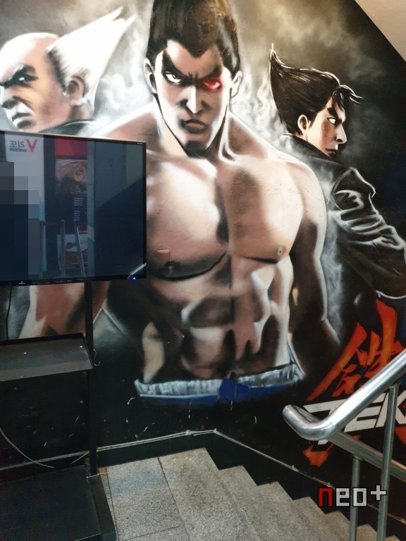 지하로 내려가는 계단에 철권 시리즈 패륜과 콩가루 집안 미시마 3대가 그려져 있다.