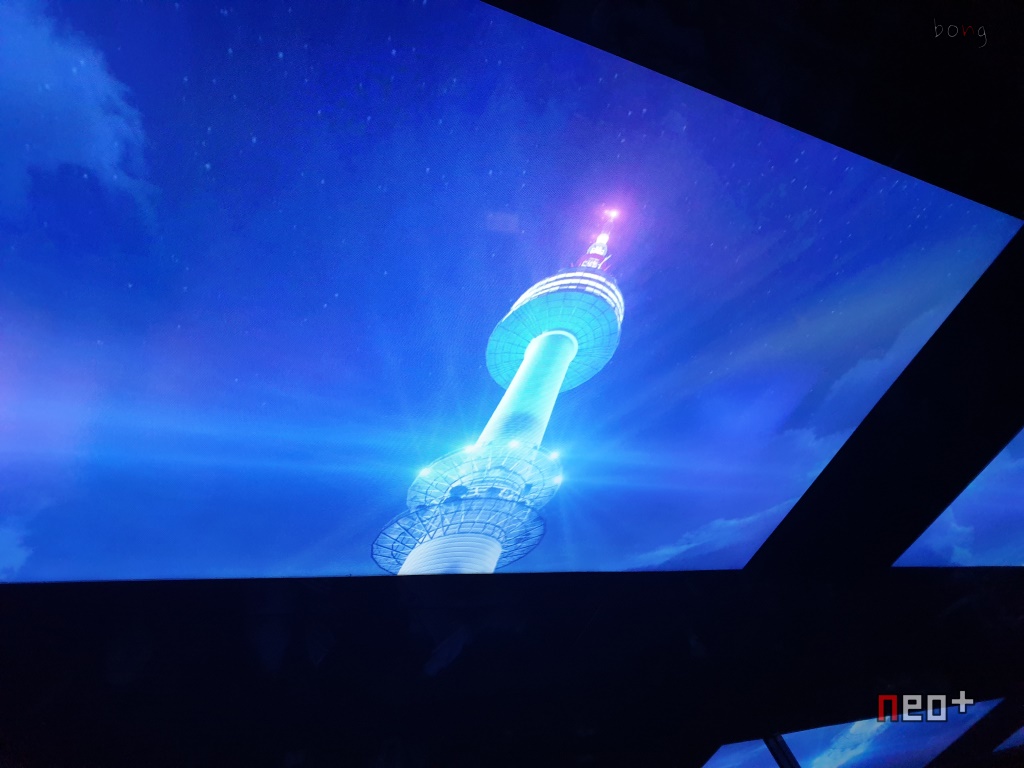 엘레베이터를 타고 내려오는중 천장에 영상을 볼수 있다.