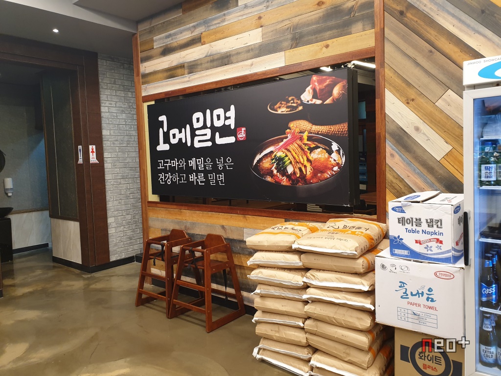 고메밀면은 간판에 적혀 있는데로 '고구마'의 '고'와 메밀의 '메'를 합쳐서 '고메'로 한것 같다.