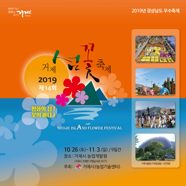 제 14회 거제섬꽃축제기간 : 2019년 10월 26일 토요일~11월 3일 일요일 9일간 개최될 예정입니다
