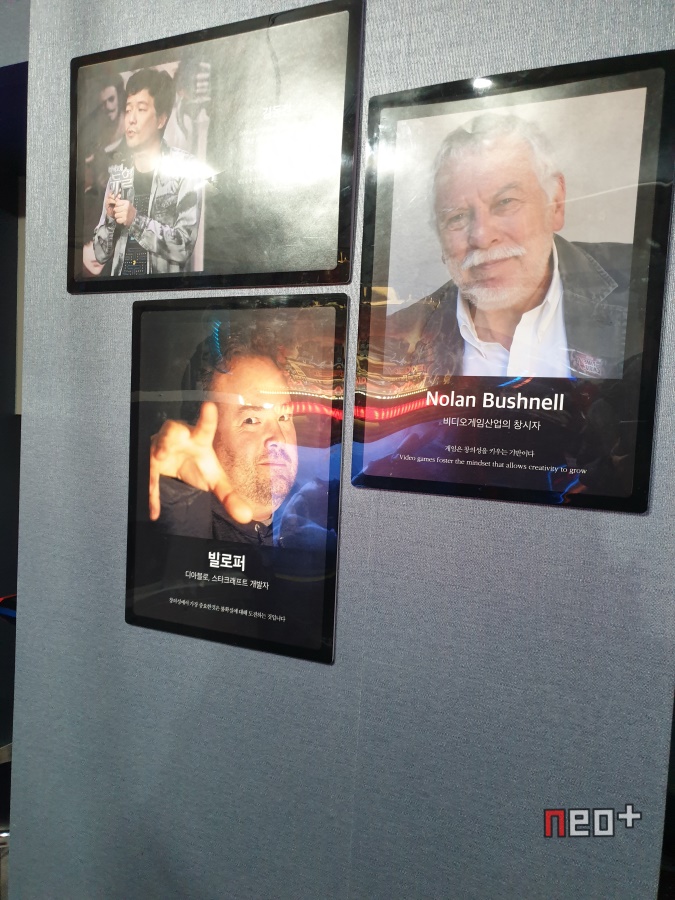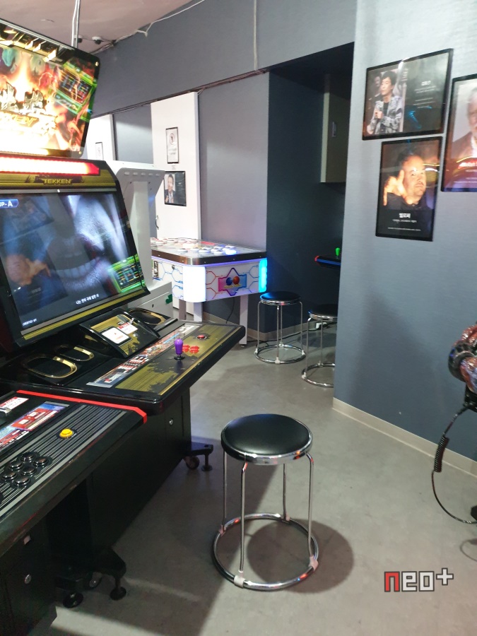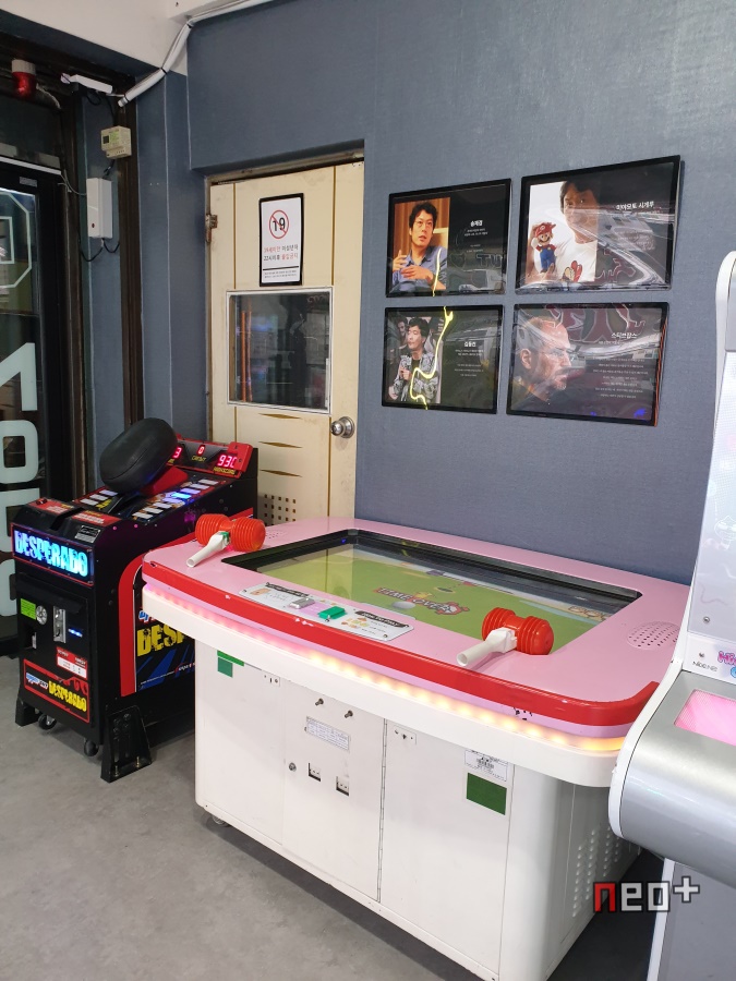 벽에 게임관련 인물들이 붙어있다.