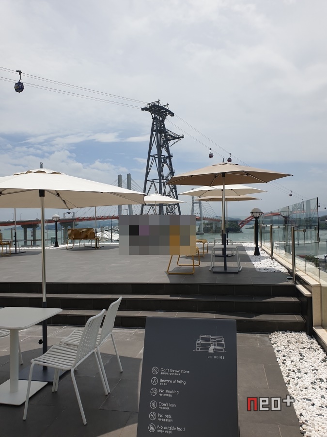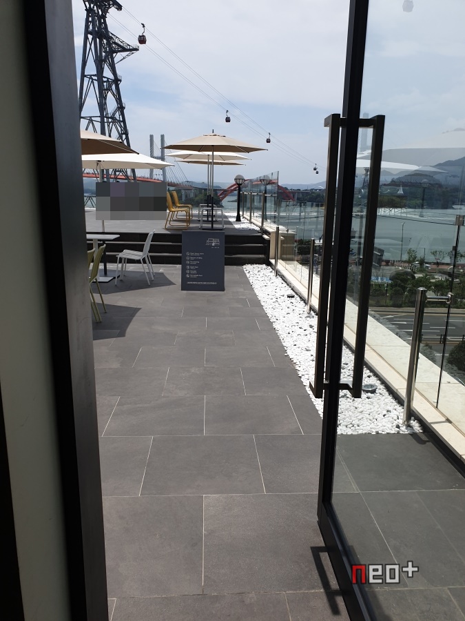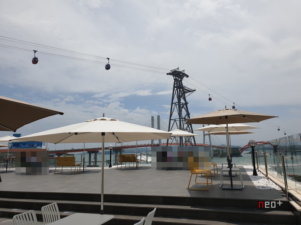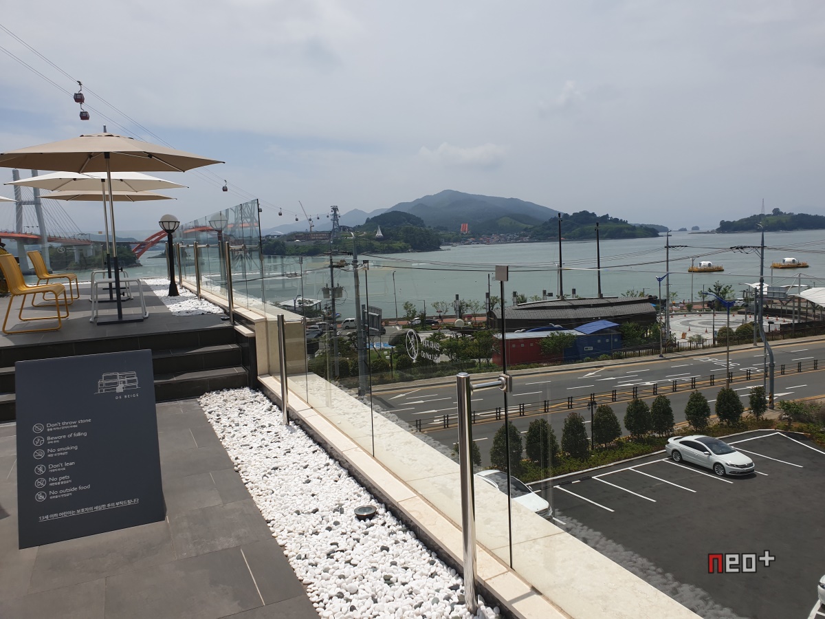 루프탑 위론 케이블카가 다니며 남해바다와 창선 삼천포대교가 보인다.