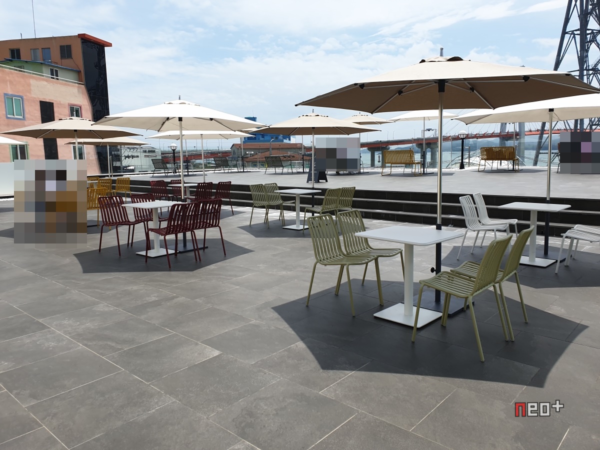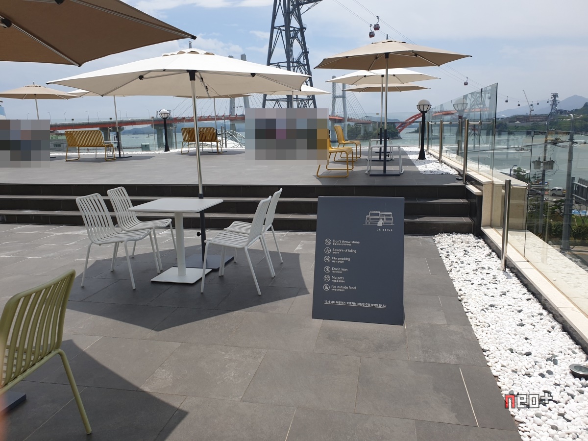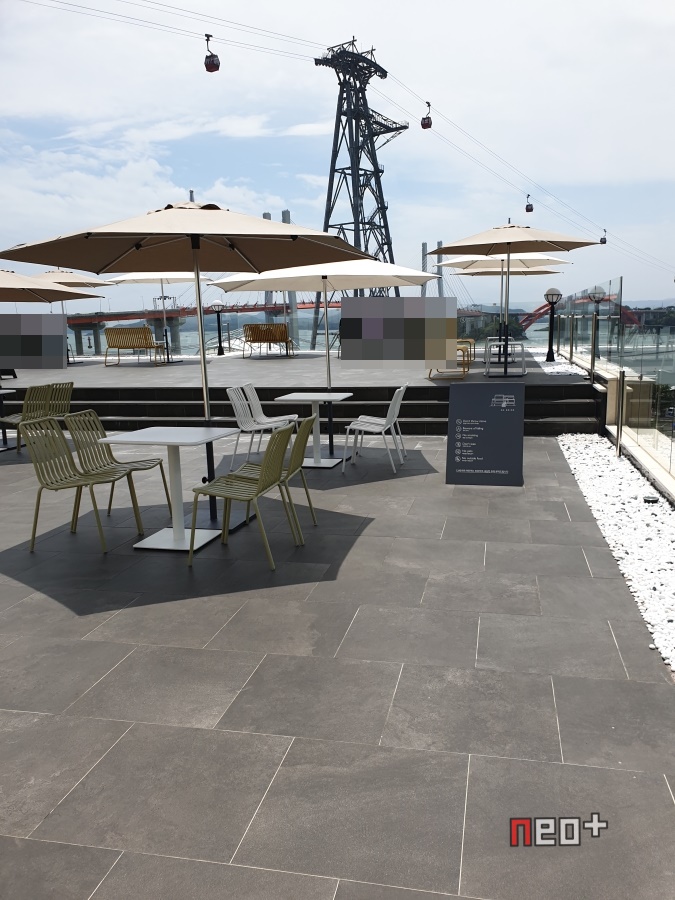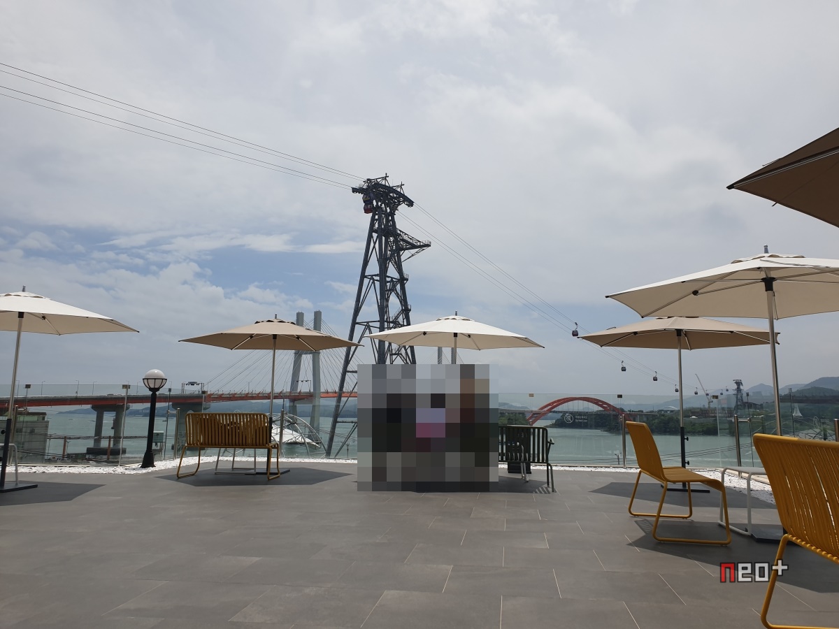 루프탑 위론 케이블카가 다니며 남해바다와 창선 삼천포대교가 보인다.