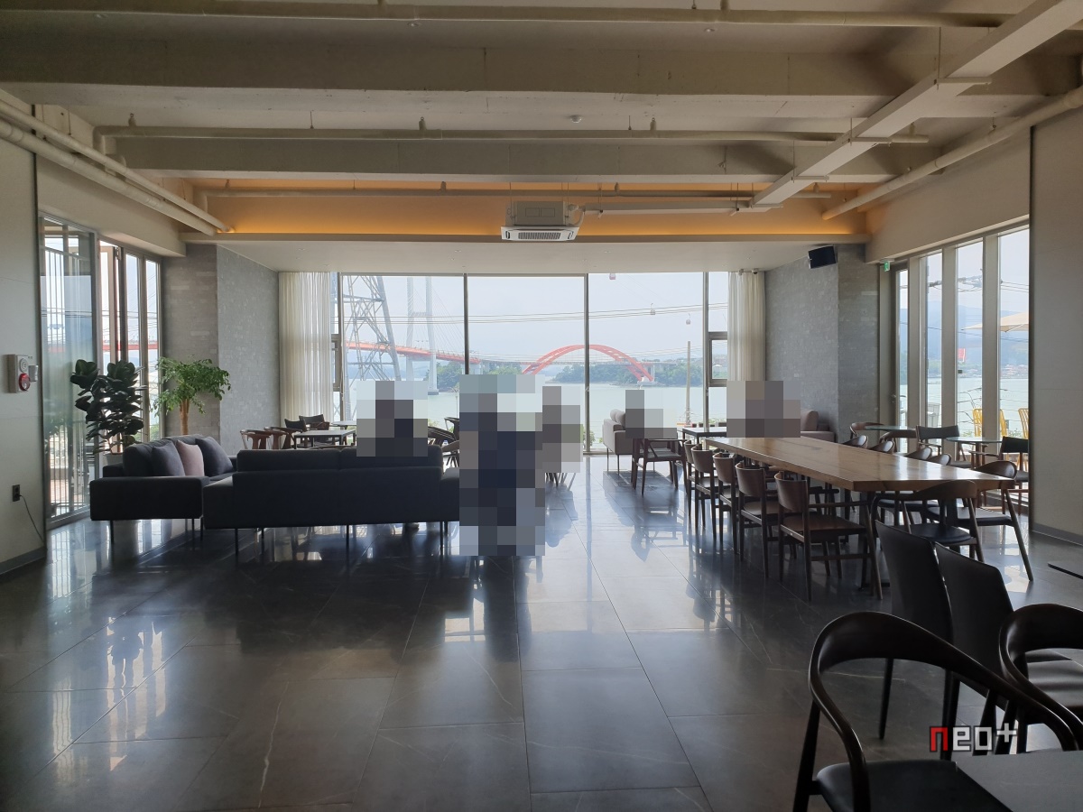밖으로 삼천포 남해바다와 케이블카 그리고 창선 삼천포 대교가 보인다.
