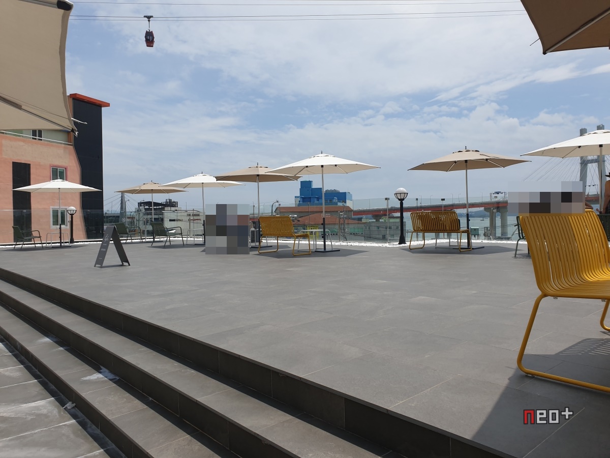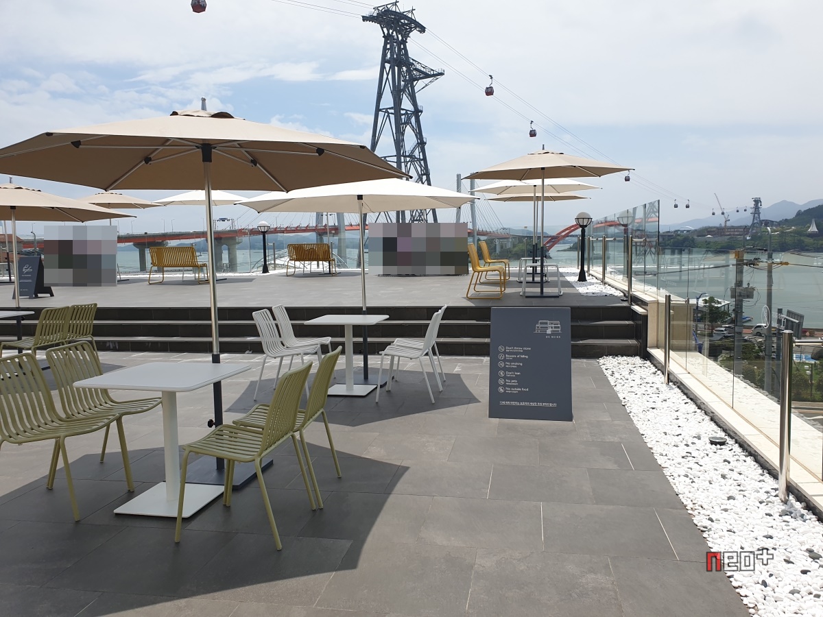 루프탑 위론 케이블카가 다니며 남해바다와 창선 삼천포대교가 보인다.