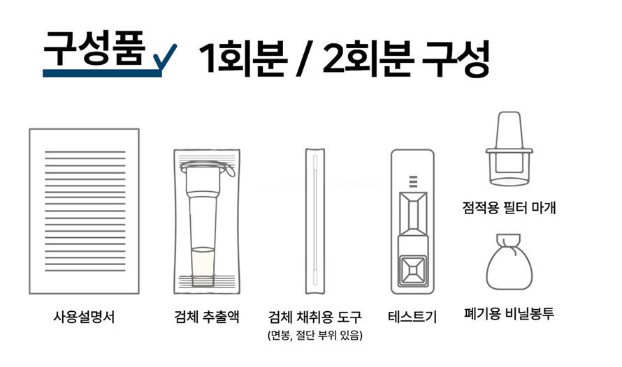 구성품은 사용설명서, 검체 추출액, 검체 채위용도구, 테스트기, 점적용 필터마개, 폐기용 비닐봉투