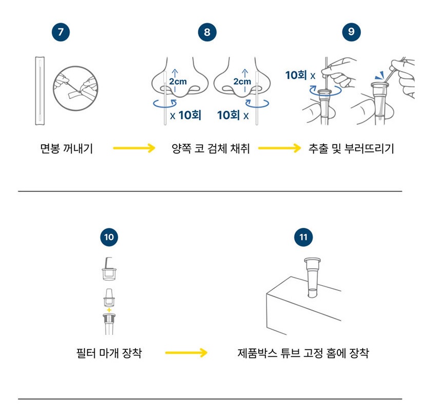 - 사용목적 : 호흡기 감염이 의심되는 개인이 비강 도말 검체에서 면역크로마토그래피법으로 코로나19 바이러스 항원의 존재 여부를 검사하는데 보조적으로 사용하는 체외진단의료기기이다.