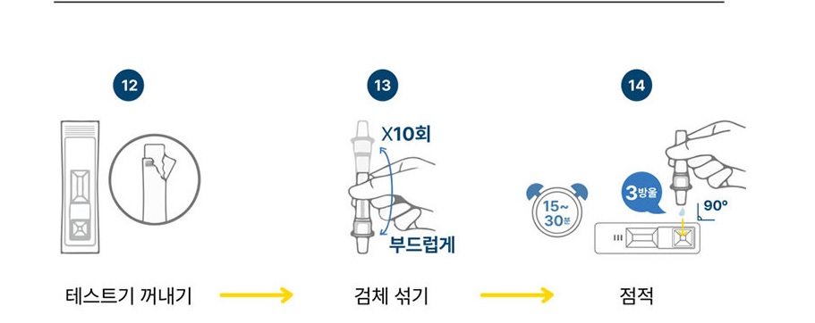 5. 테스트기에 검체 3방울정도 떨어트리면 15~30분후에 결과가 나온다.