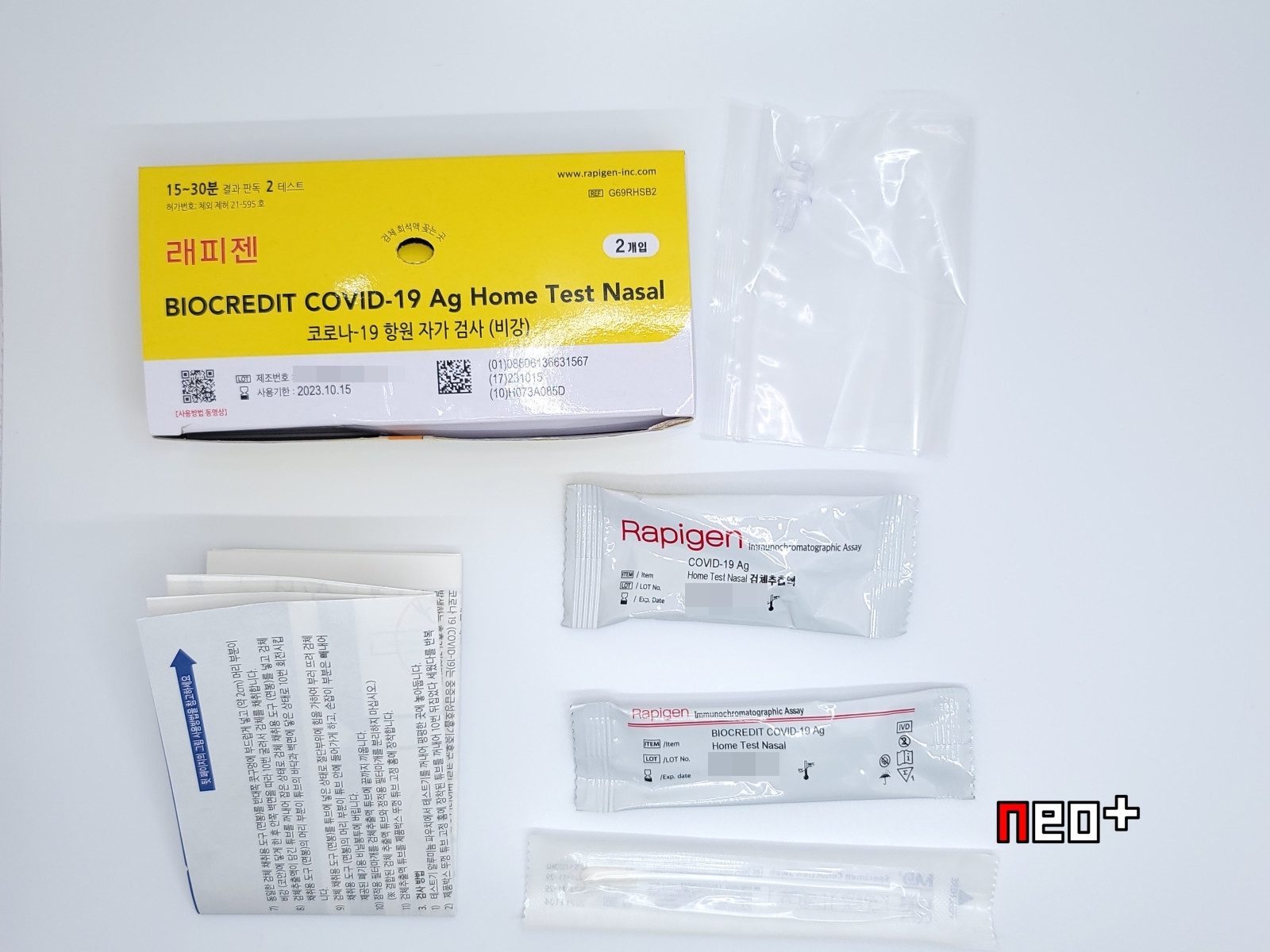 구성품은 사용설명서, 검체 추출액, 검체 채위용도구, 테스트기, 점적용 필터마개, 폐기용 비닐봉투