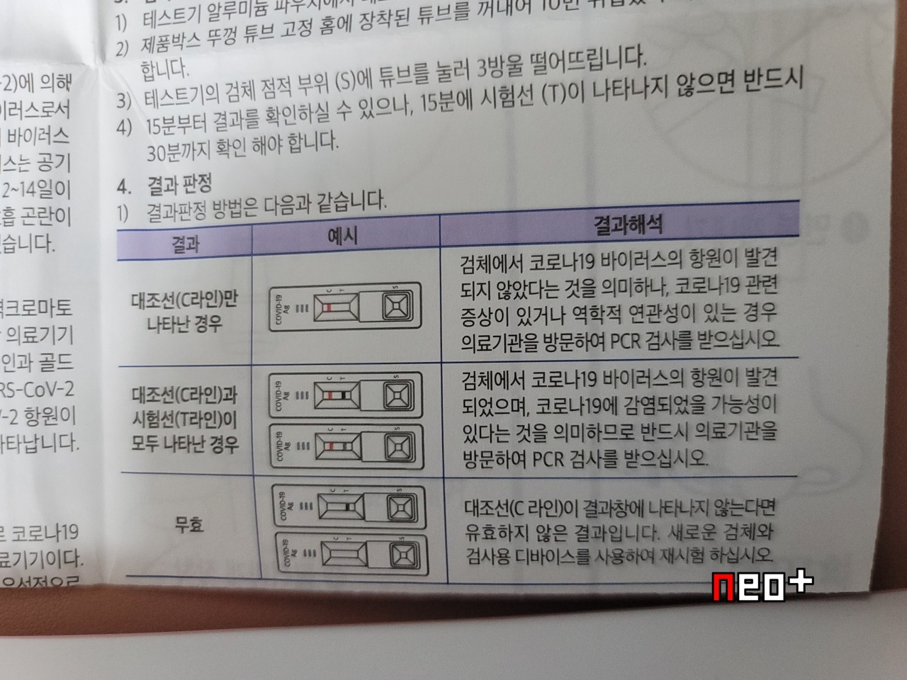 S부분에 검체를 3방울 정도 넣으면 테스트용지로 스며들어 결과가 나오는 방식이다.
