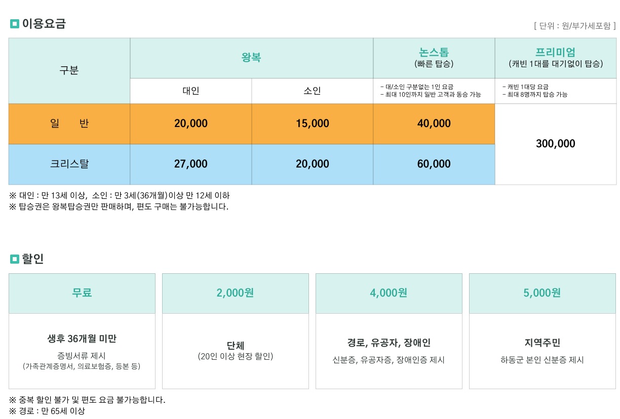 소인(만13세미만) : 왕복 일반 15000원, 크리스탈 20000원이다.