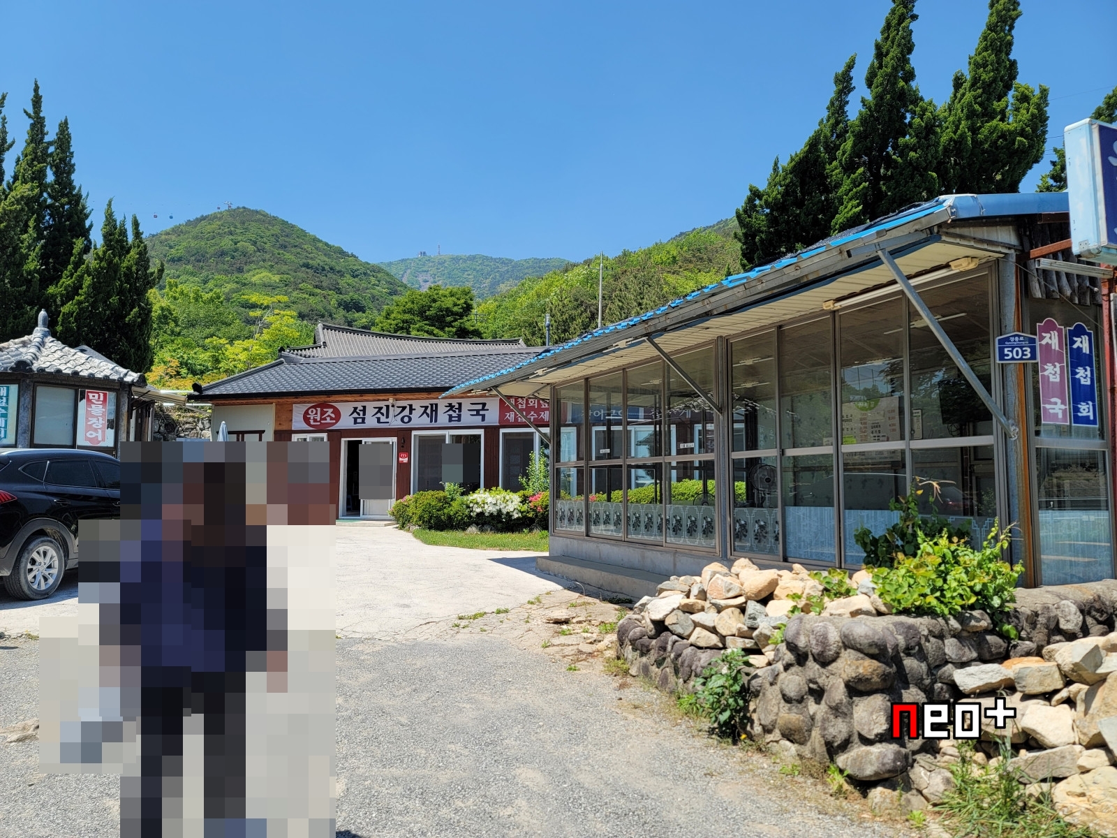 왼쪽부분에 보이는 '원조섬진강재첩국'이 본체로 보이며 오른쪽에 보이는 가건물처럼 보이는곳은 아마 상황에 따라 추가로 운영하는것 같다.