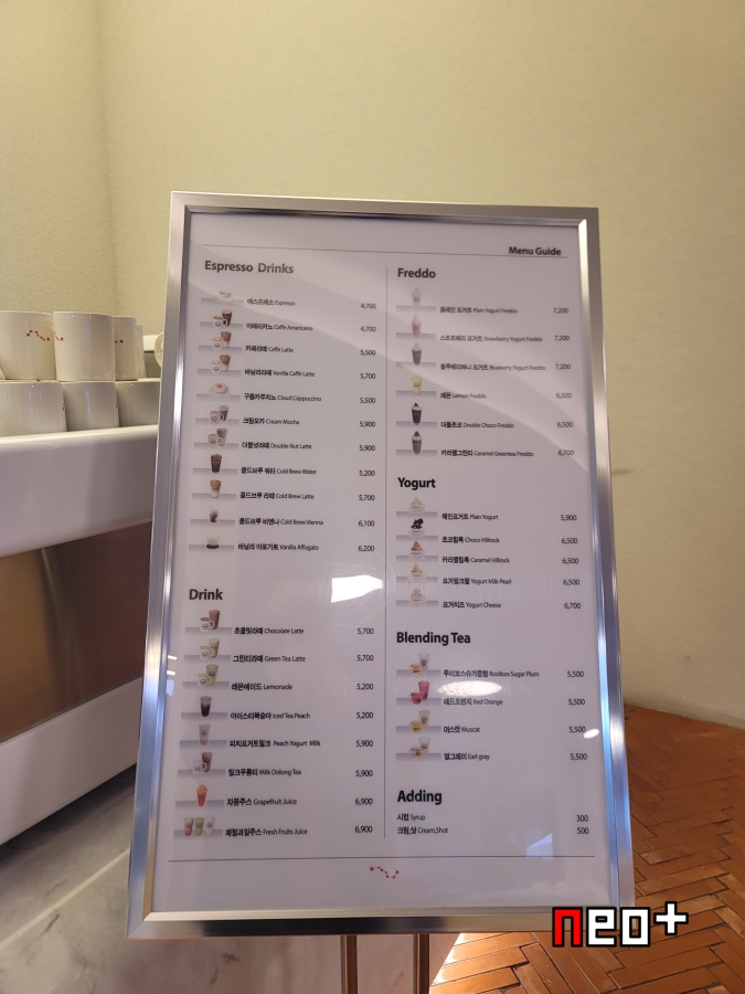 에스프레소 드링크와, 프레또, 드링크, 블렌딩 티, 요거트 라인으로 되어있다.