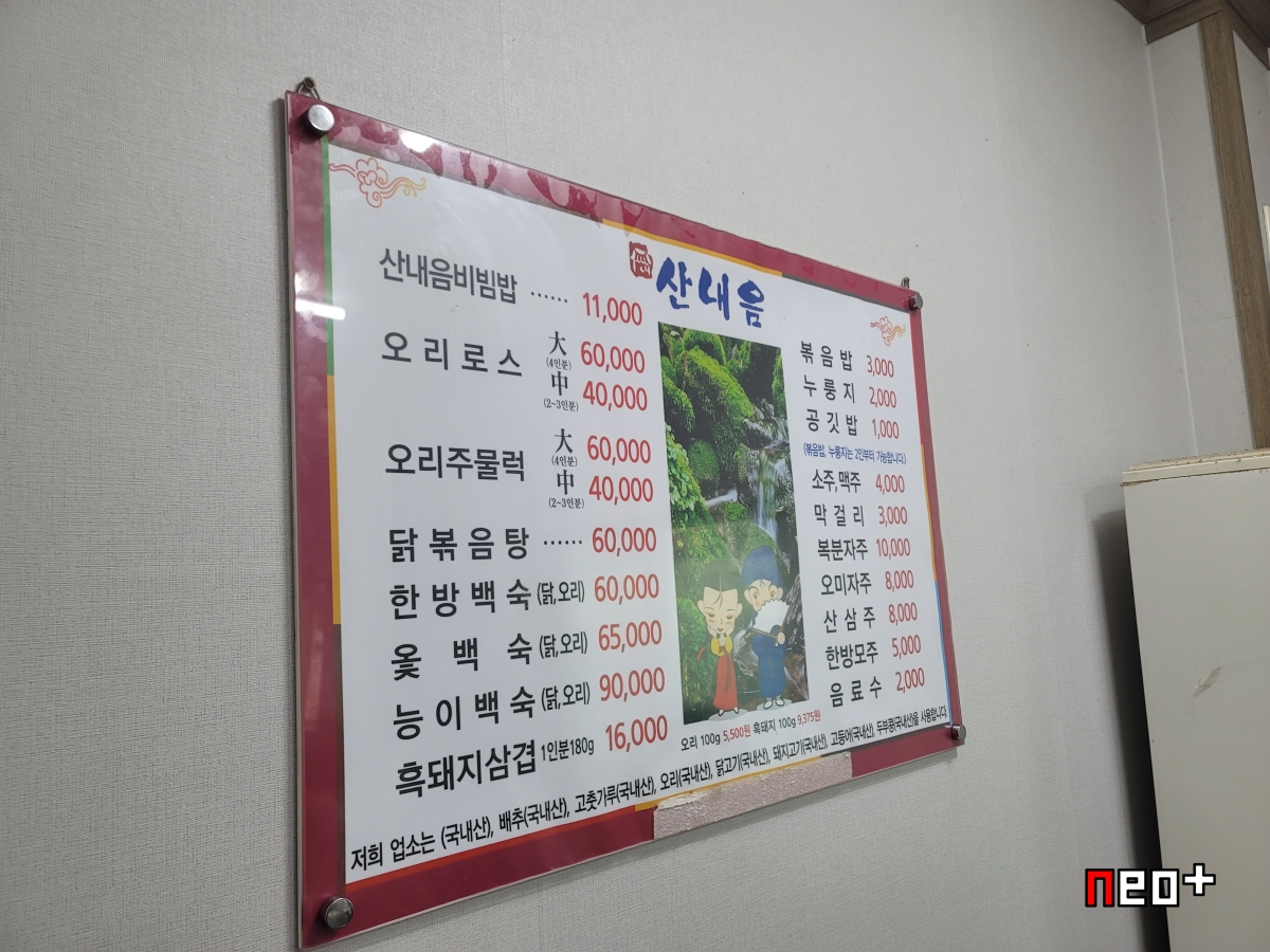 산내음비빔밥, 오리로스, 오리주물럭, 닭볶음탕, 한방백숙, 옻백숙, 능이백숙, 흑돼지삼겹
