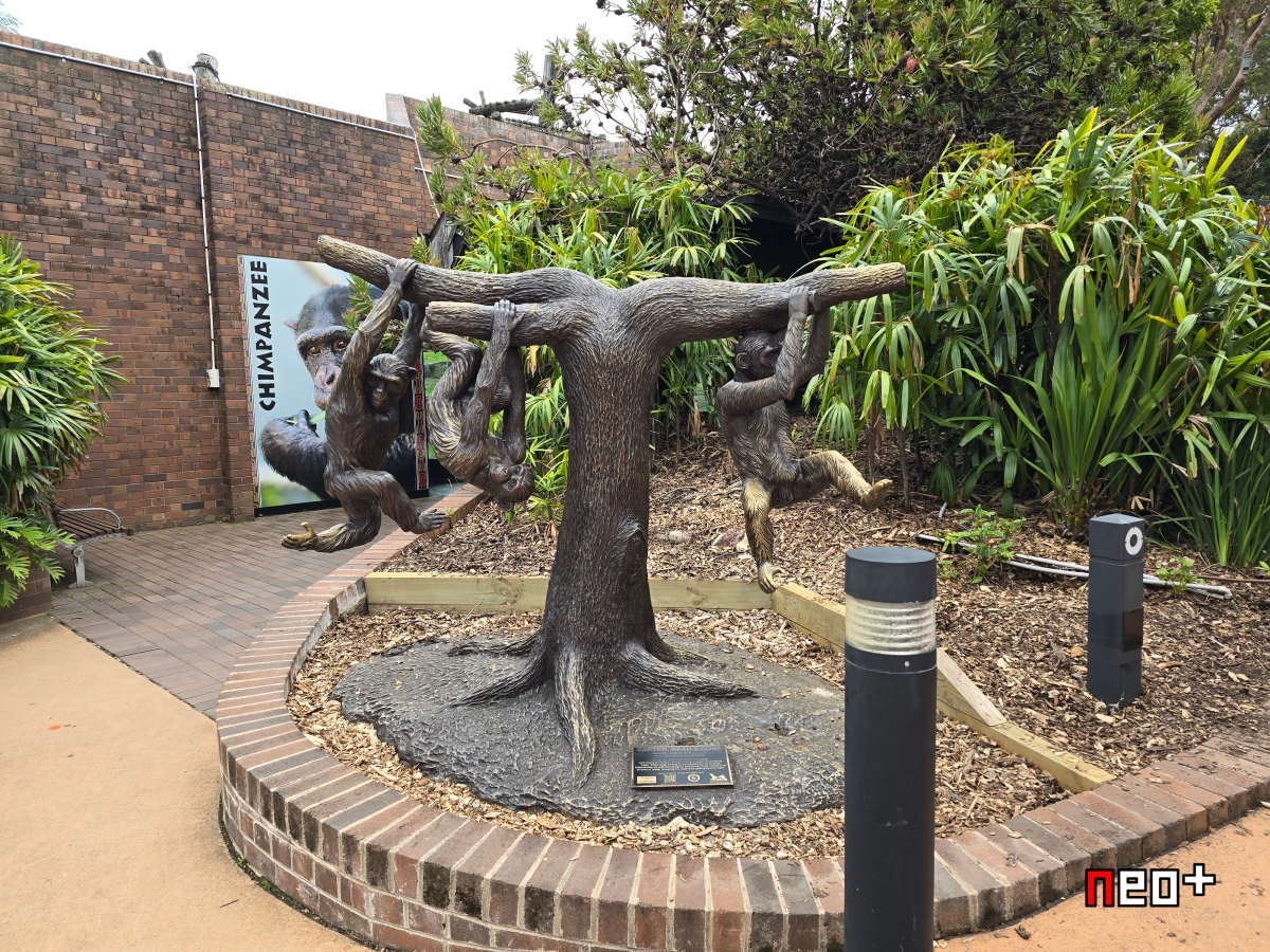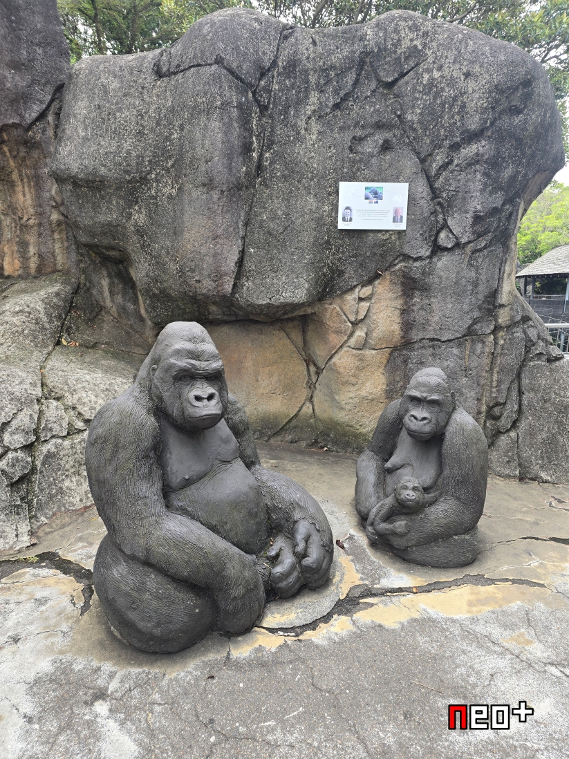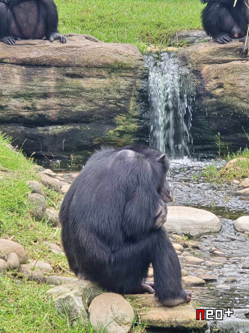 모형처럼 보이지만 실제 침팬지가 앉아있다.
