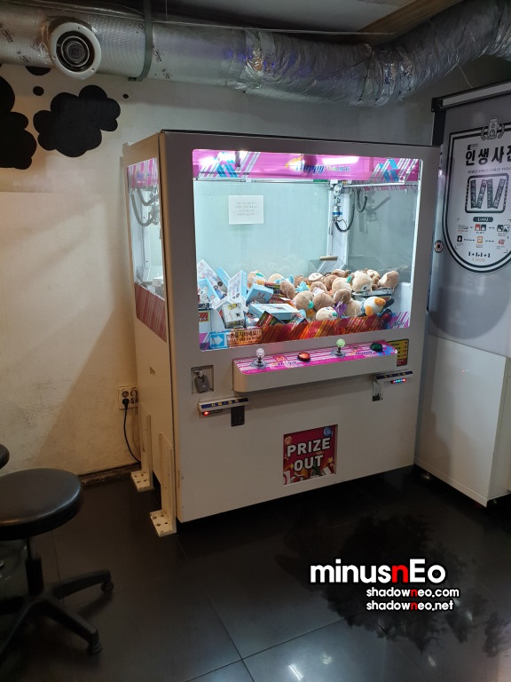 입구에 펀치볼 게임이 있고 인형뽑기 기기가 보인다.
