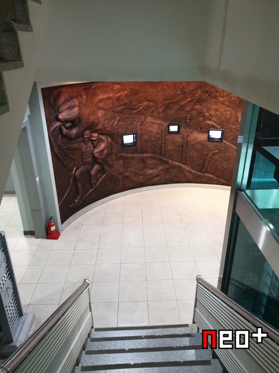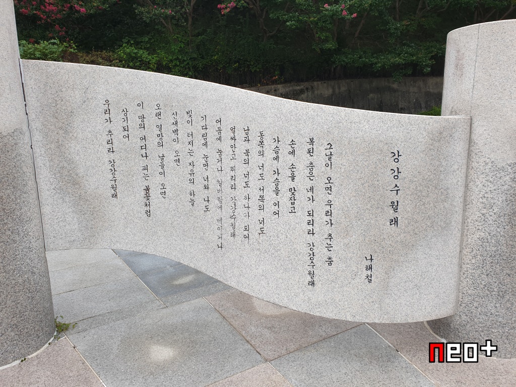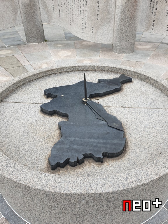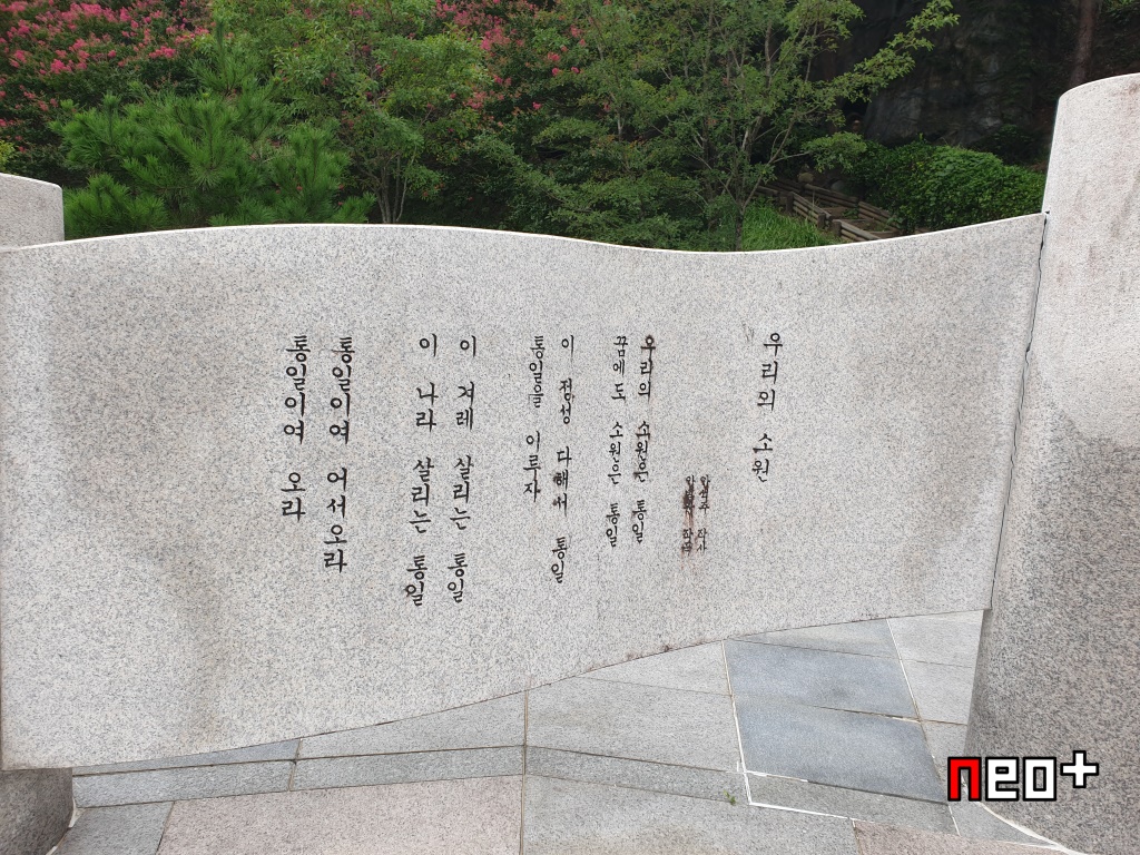 한가운데 한반도의 시계와 노래 가사, 시등을 적은 석판이 있다.