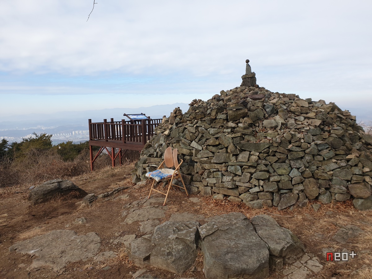 돌탑 위엔 의자가 있다.