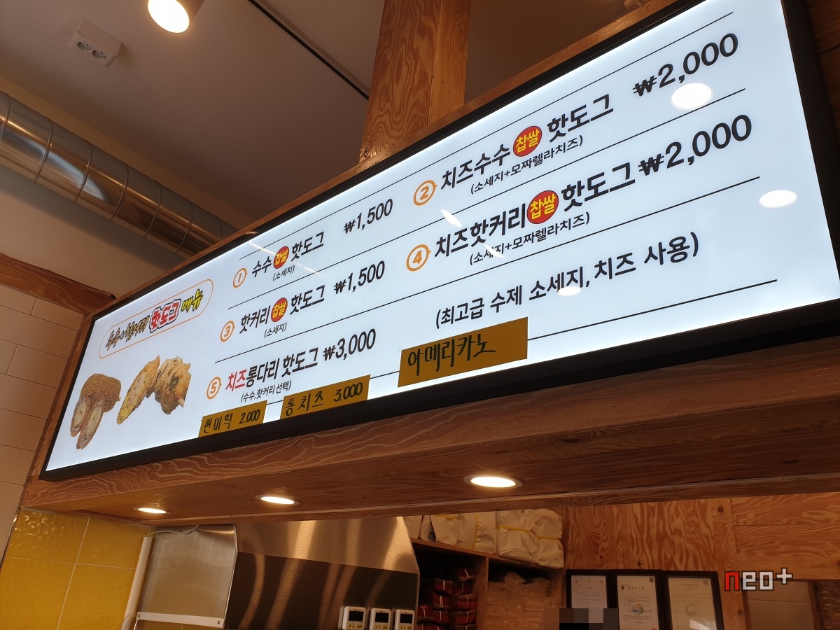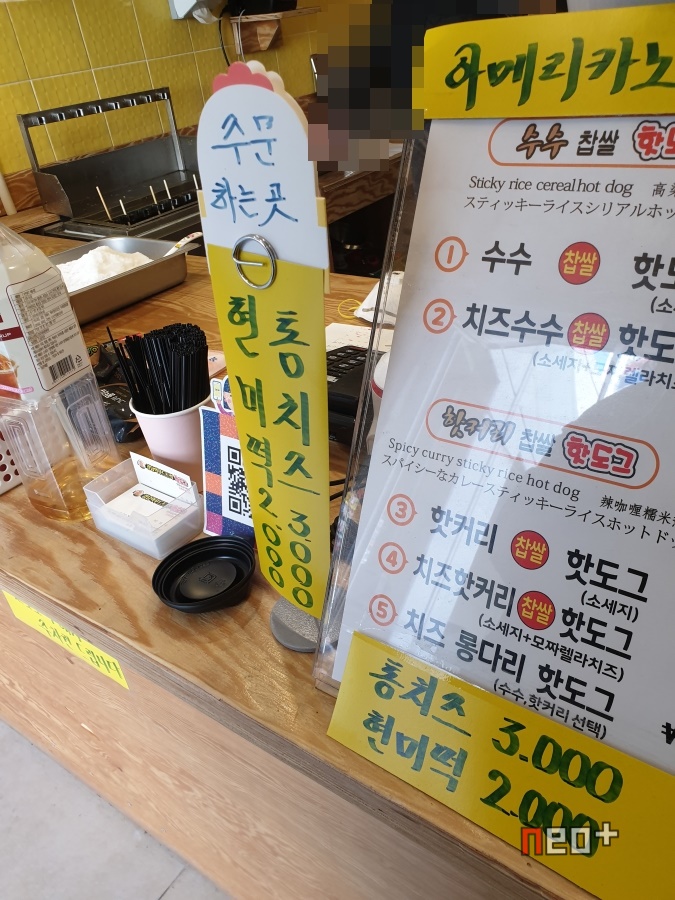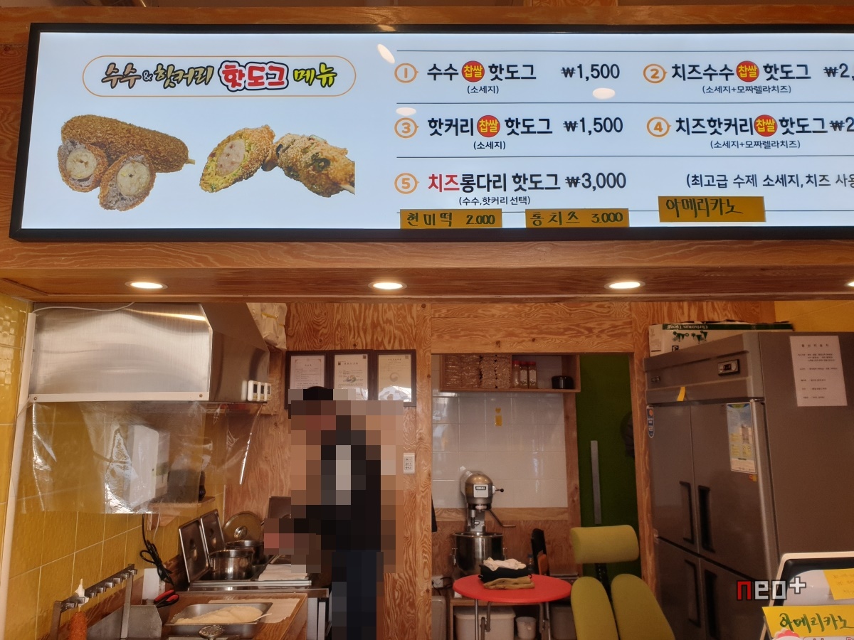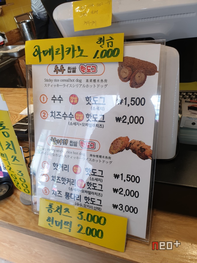 수수 핫도그 1500원(소세지), 치즈수수 찹쌀 핫도그 2000원(소세지+모짜렐라 치즈)
