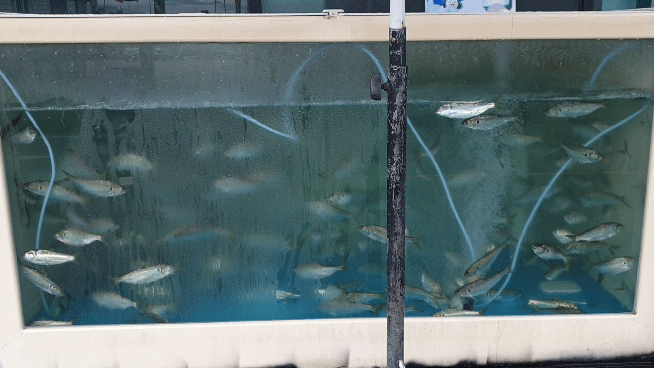 입구에 수족관에 전어가 있다.