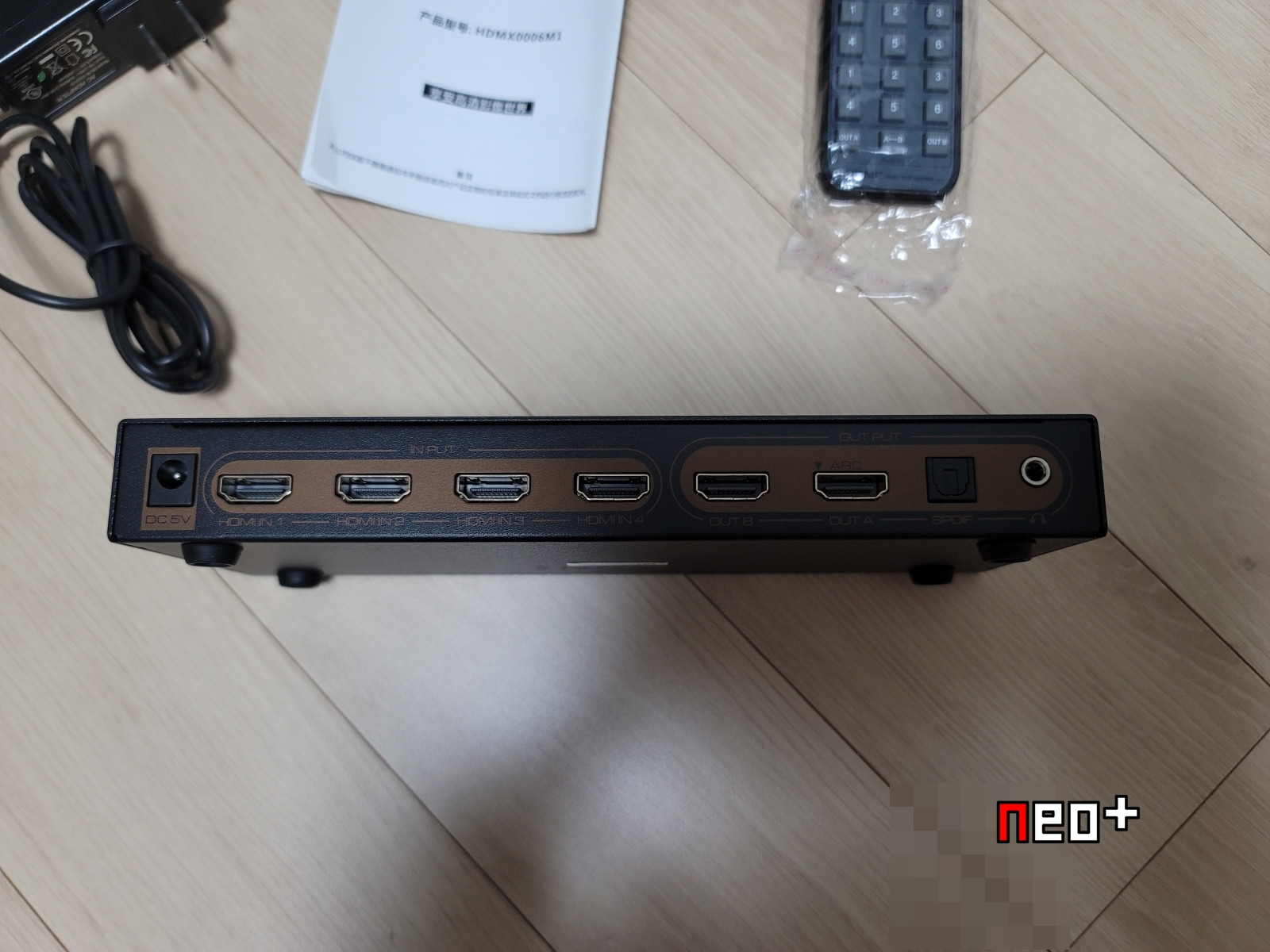 전원 부 (DC 5V)와 입력포트 4개(1,2,3,4), 출력 포트2개(A,B) 광출력포트와 3.5파이 오디오출력부가 있다.