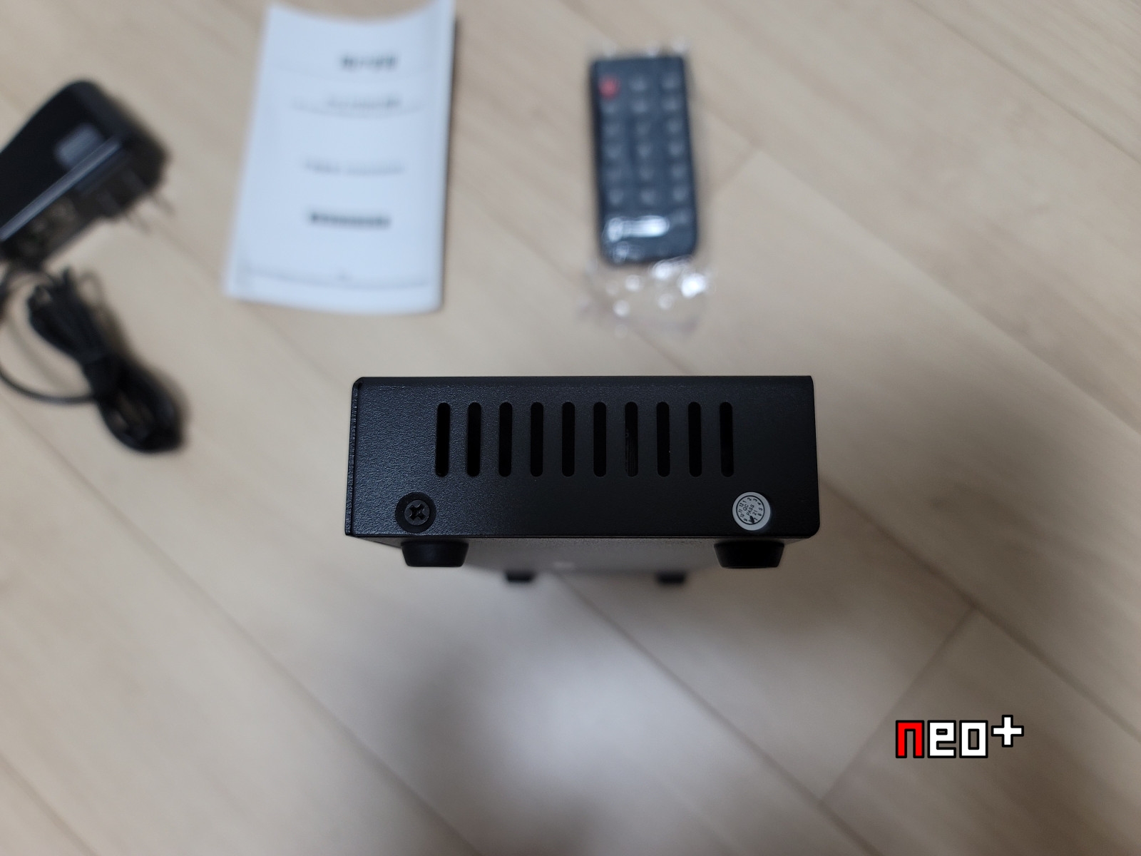 내용물은 제품, 전원아답터, 설명서, 리모콘이 있다.