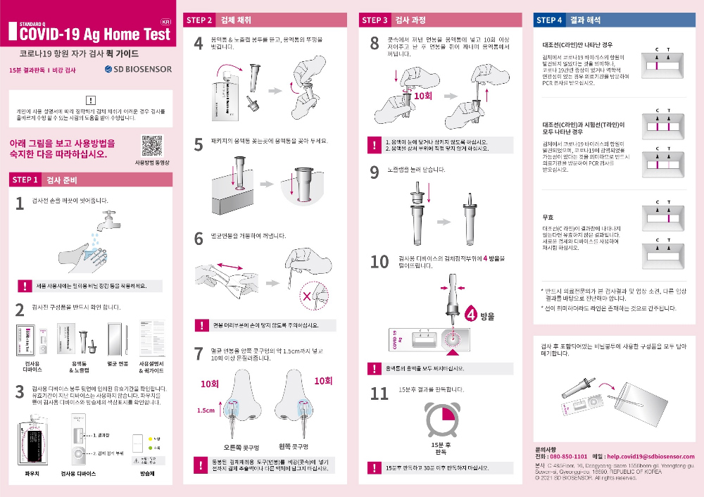 - 제품명 : 에스디 바이오센서 스탠다드큐 코로나-19 항원 자기 검사(비강) [SD BIOSENSOR STANDARD Q COVID-19 AG HOME TEST NASAL, 감염체 진단 면역검사시약]