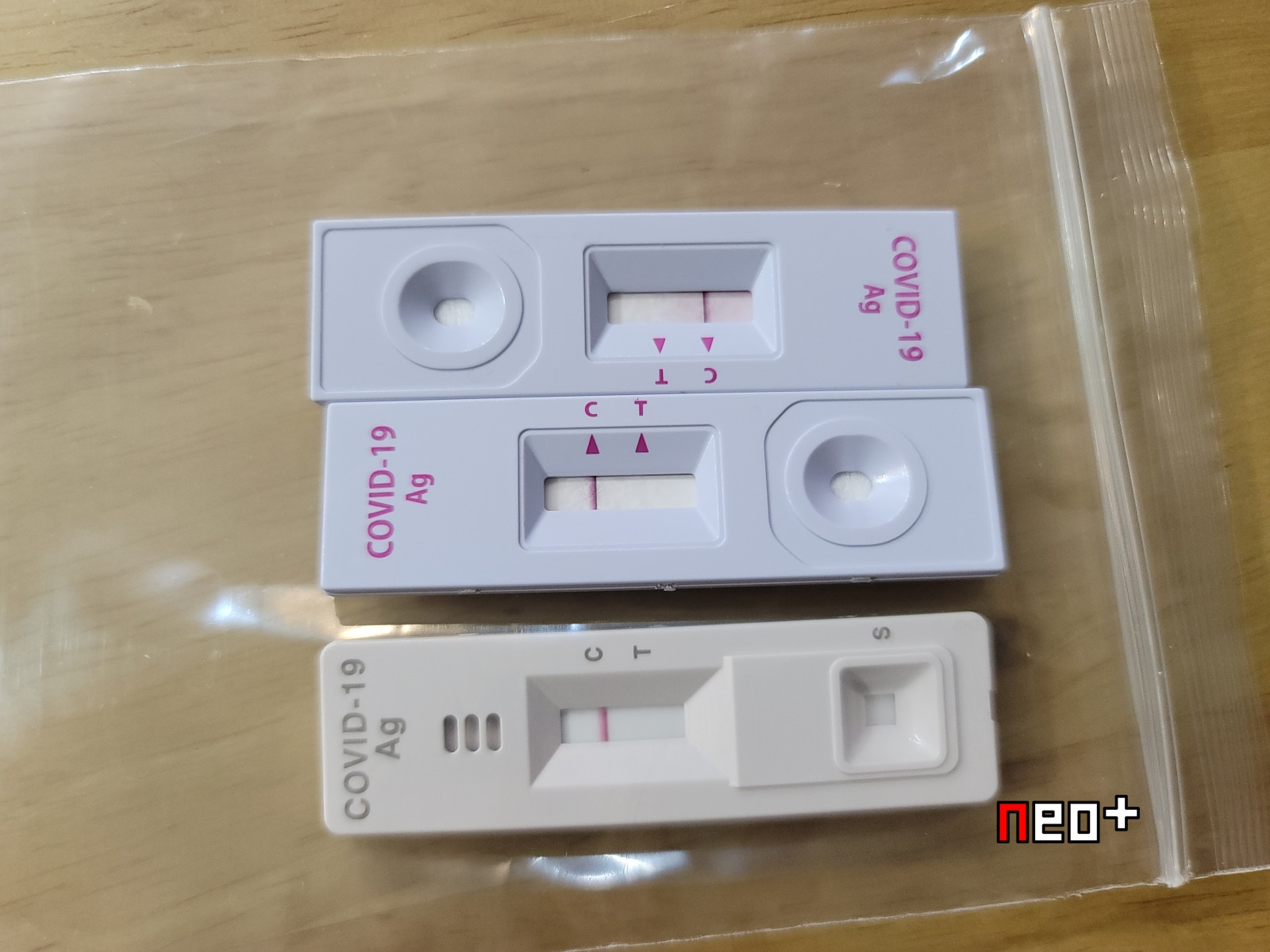 대조선(C라인)만 나오고 시험선(T라인)이 나오지 않아 항원이 없음. 즉 음성