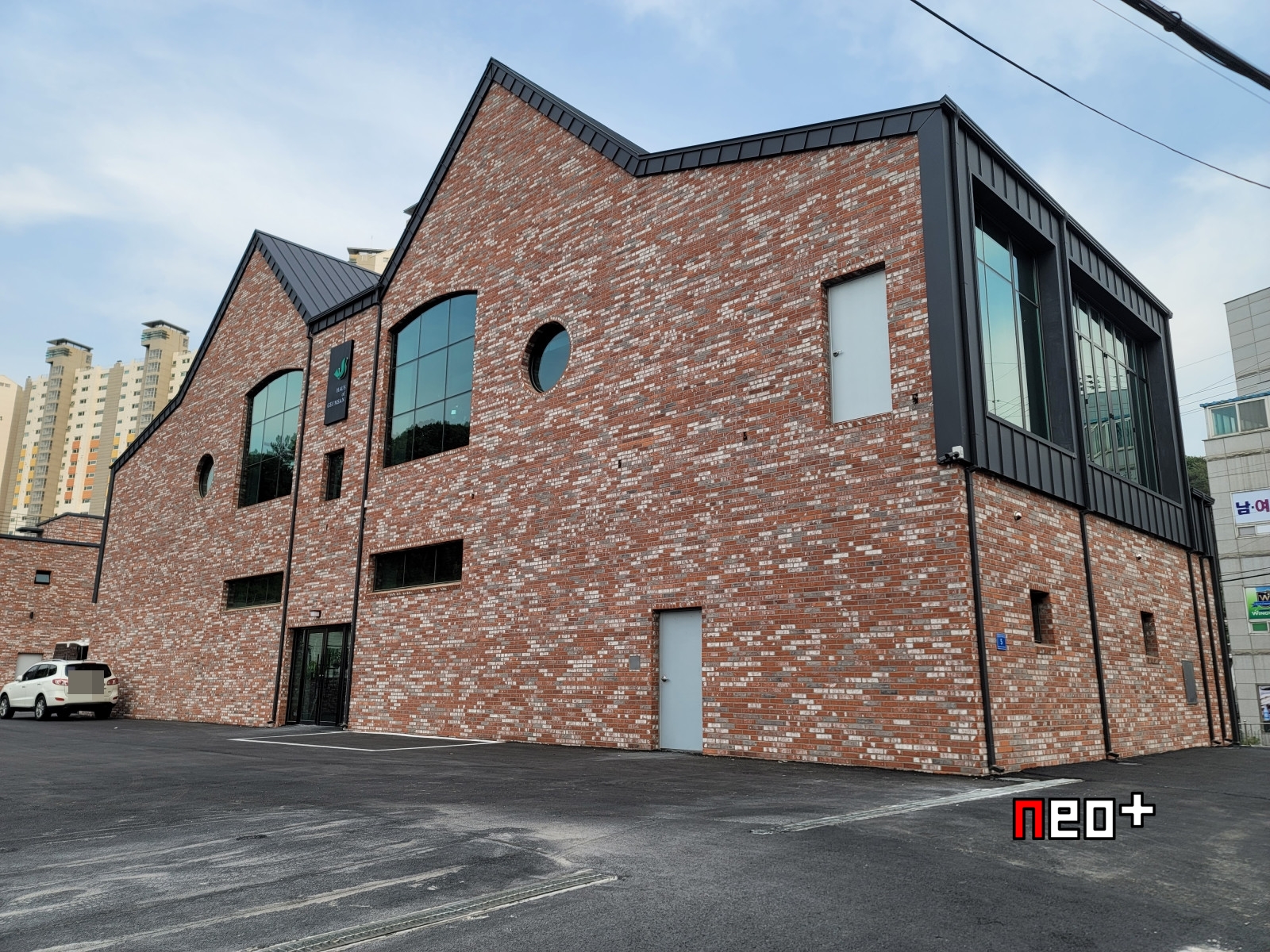 건물 뒷면에 주차장이 있다.