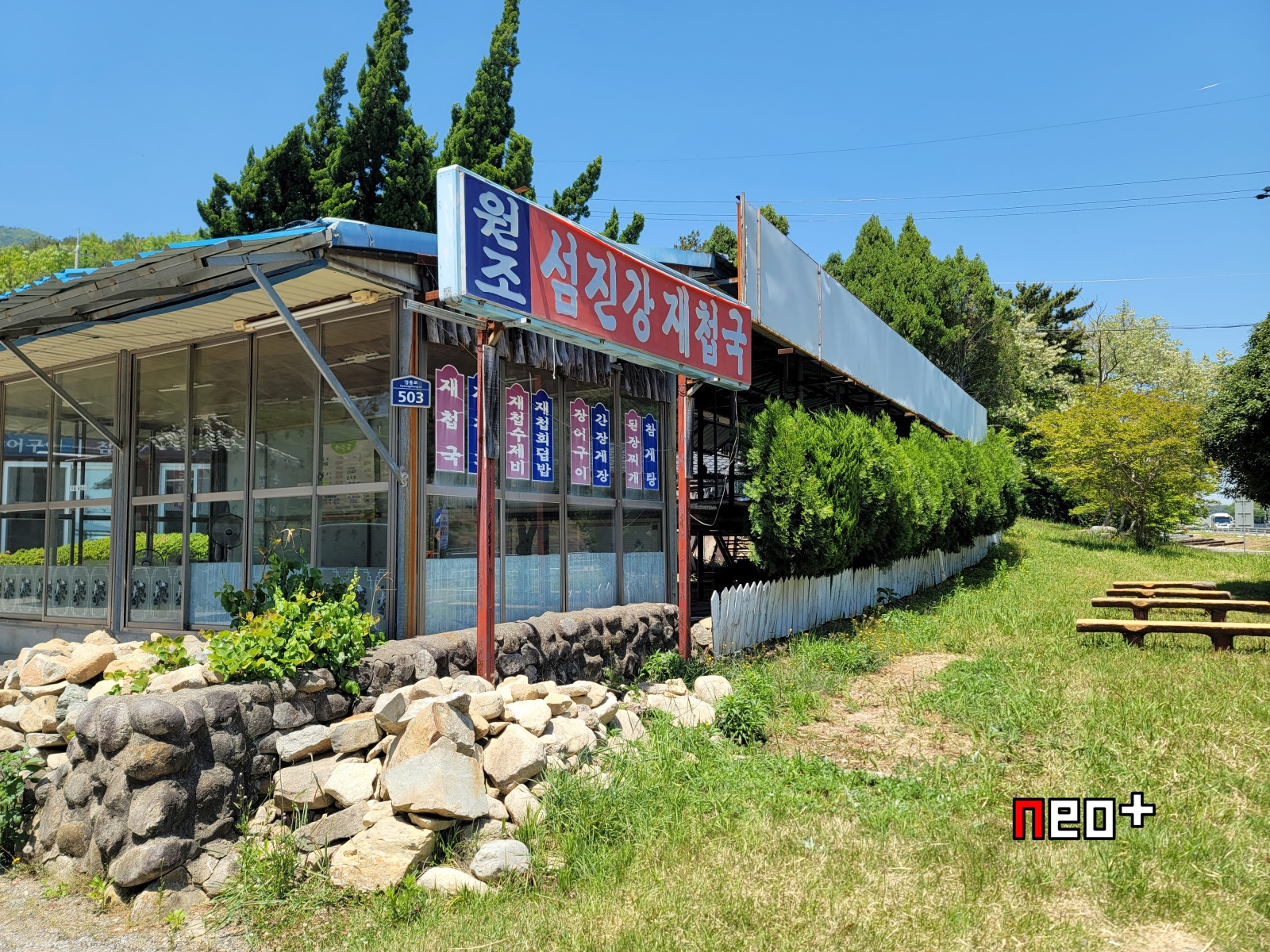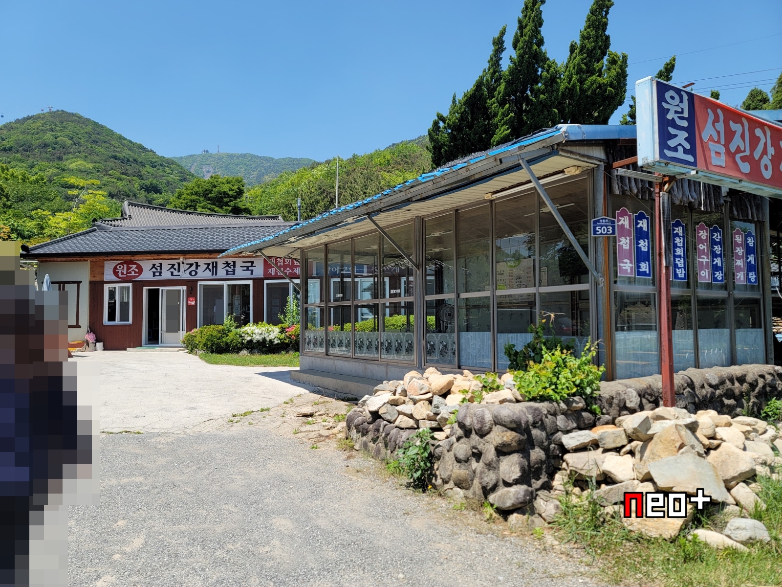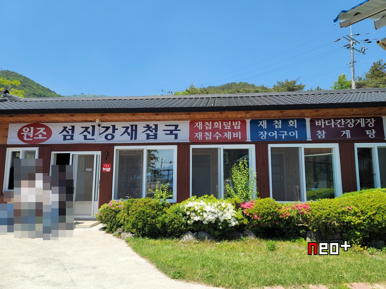 왼쪽부분에 보이는 '원조섬진강재첩국'이 본체로 보이며 오른쪽에 보이는 가건물처럼 보이는곳은 아마 상황에 따라 추가로 운영하는것 같다.