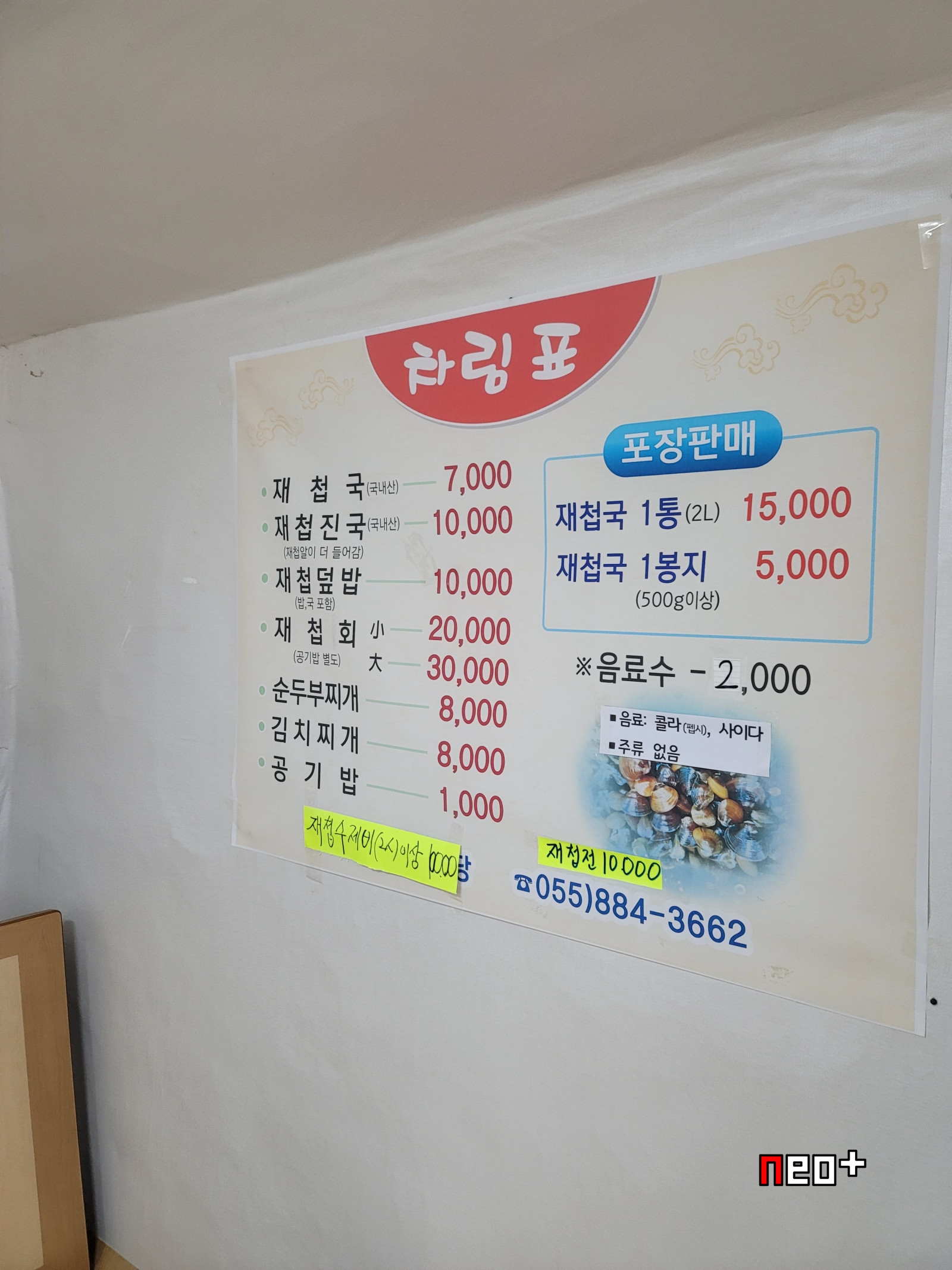 재첩국, 재첩진국, 재첩덮밥, 재첩회(소,대), 순두부찌개, 김치찌개, 공기밥