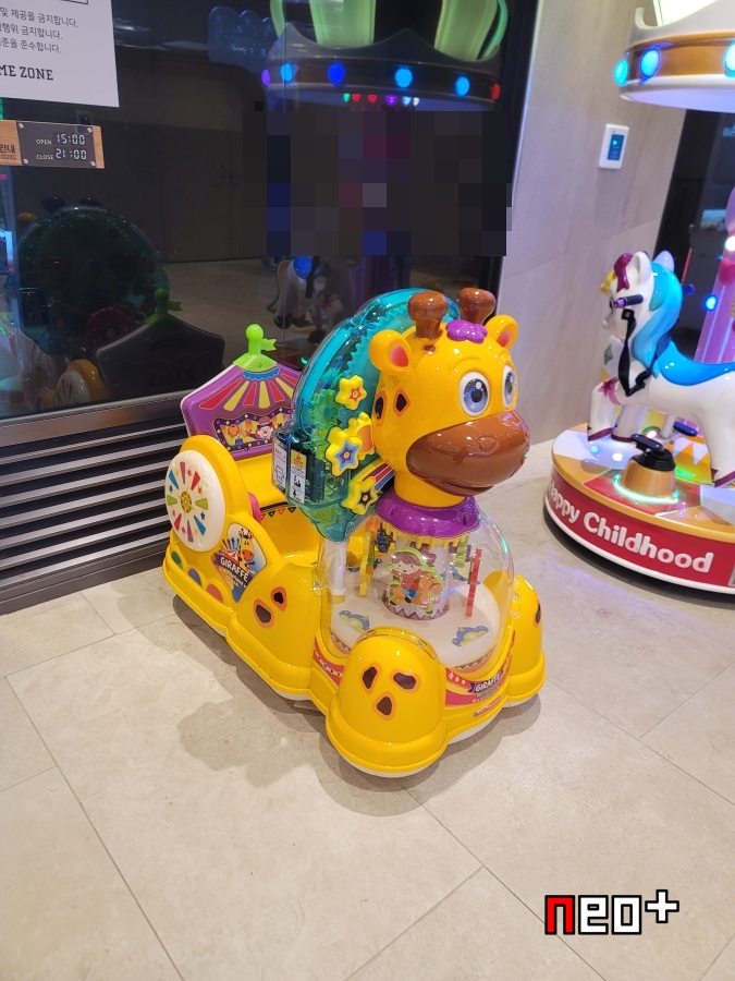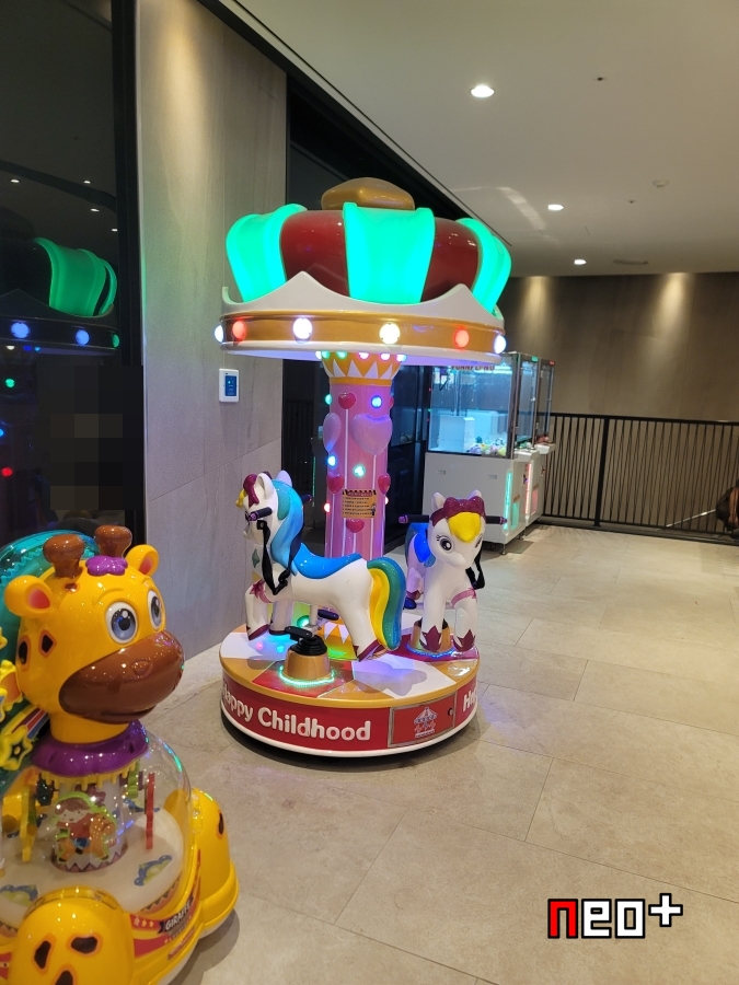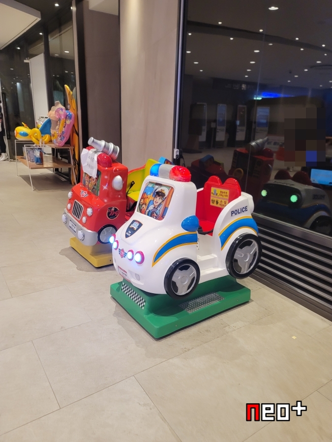 오락실 앞 입구에 아동용 탈것이 있다.