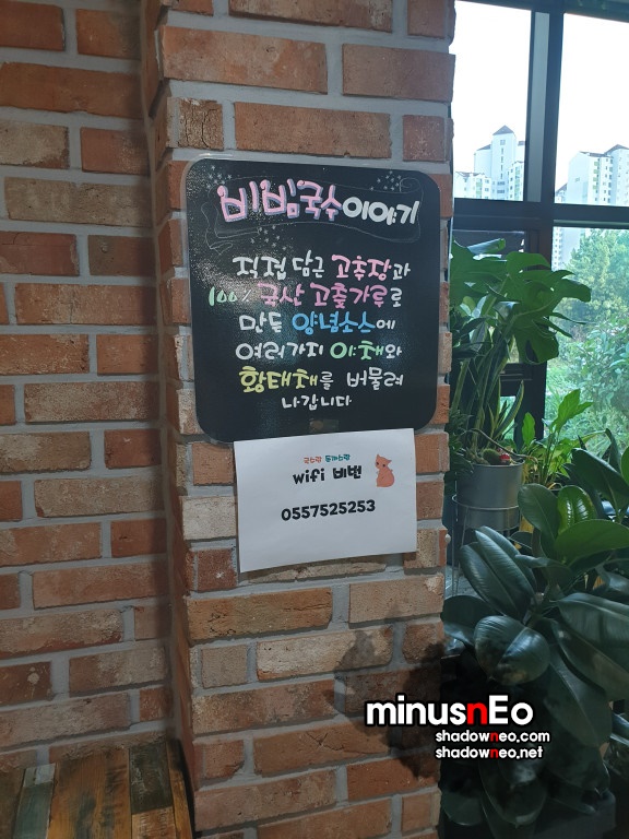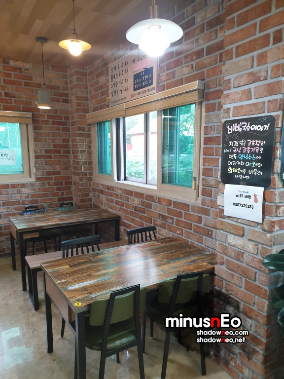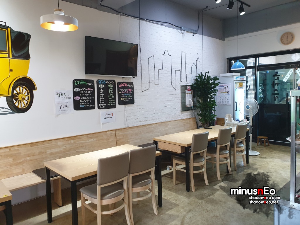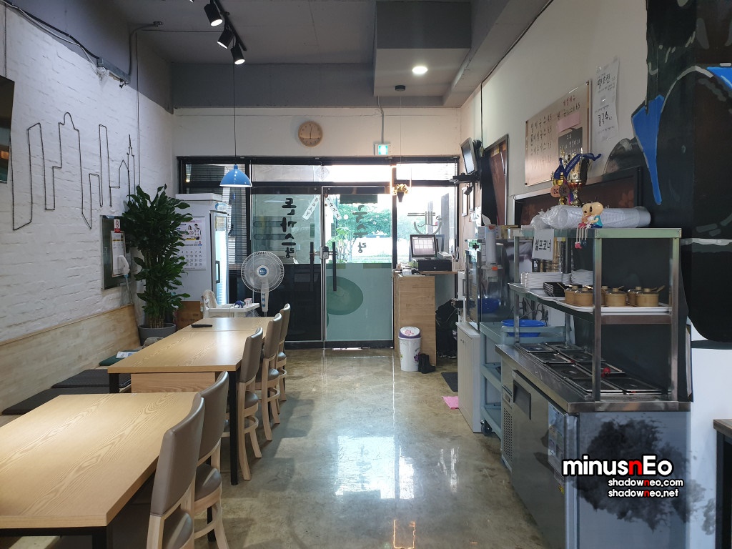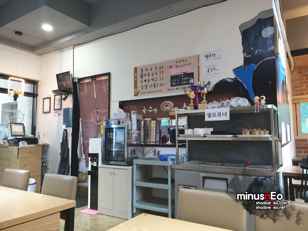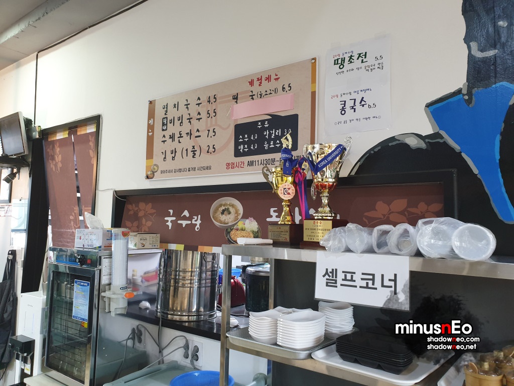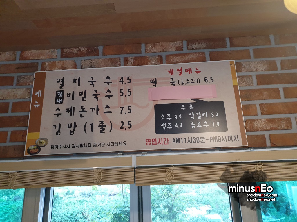 메뉴는 '멸치국수', '황태 비빔국수', '수제돈까스', 김밥', '떡국' 그리고 간단한 음료와 주류(소주, 맥주, 막걸리)를 판다.