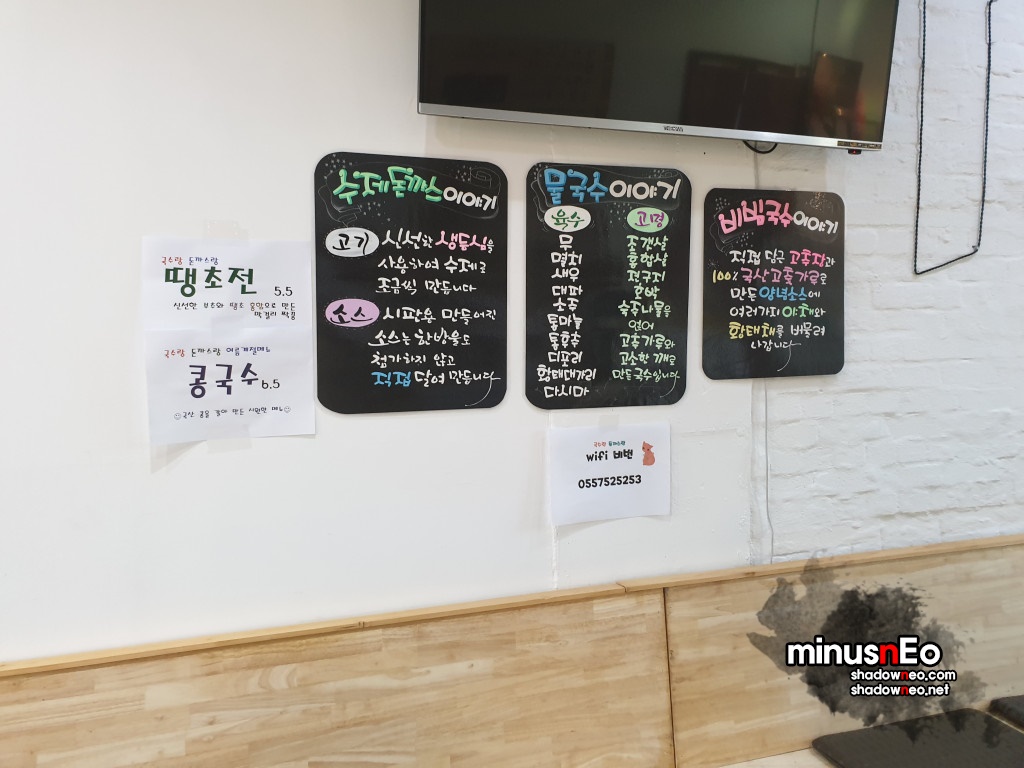 상호처럼 국수와돈까스를 팔며 그외에도 김밥 땡초전등 몇몇종류를 더 판다.